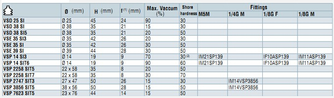 詳細(xì)信息 VSD25SI,VSD38SI,VSD35SI,VSD39SI,VSD14SI3,VSD2258SIT5,VSD2747SIT3,VSD3856SIT5,VSD7623SIT5,COVAL吸盤 VSD_VSE_VSP系列吸盤,特別為食品生產(chǎn)專門設(shè)計(jì),材料:硅膠(SI),半透明硅膠(SIT),有多種形狀和硬度可選擇,使用溫度:-40~220℃。 主要參數(shù)見下表: