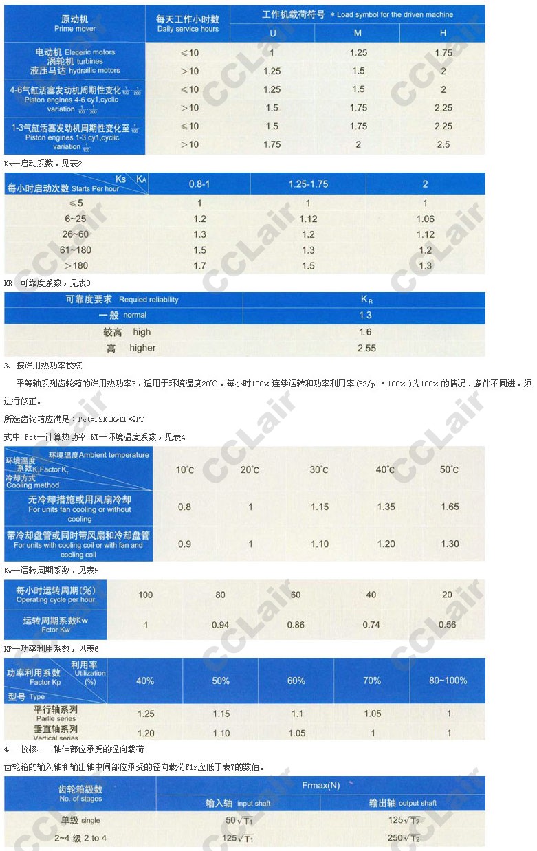 平等軸系列齒輪箱的公稱輸入功率PA(表9—20)按載荷平穩(wěn),每天工作時間小于或等于10h,每小時啟動不超過5次,允許啟動轉(zhuǎn)矩為工作轉(zhuǎn)矩的2倍,單向運轉(zhuǎn),單對齒輪的接觸強度安全系數(shù)約為1,失效率概率小于或等于1%等條件計算確定的。齒輪箱雙向運轉(zhuǎn)時,需視情況將PN乘上0.8—1.0的系數(shù),當反向載荷大,換向頻繁、選用的可靠度系數(shù)KR較低時,系數(shù)取較小值,反之取較大值。