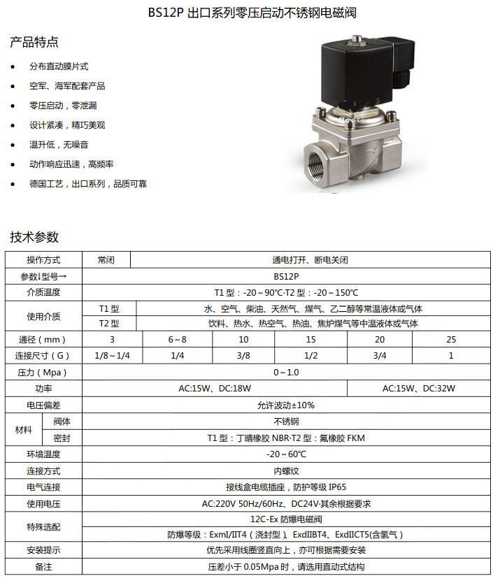 BS12P-DN3,BS12P-DN6,BS12P-DN8,BS12P-DN10,BS12P-DN15,BS12P-DN20,BS12P-DN25,通用不銹鋼電磁閥