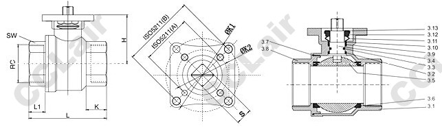 | DN | RC | L | K | SW | H | S | K1 | K2 | 不銹鋼球閥訂貨號 |