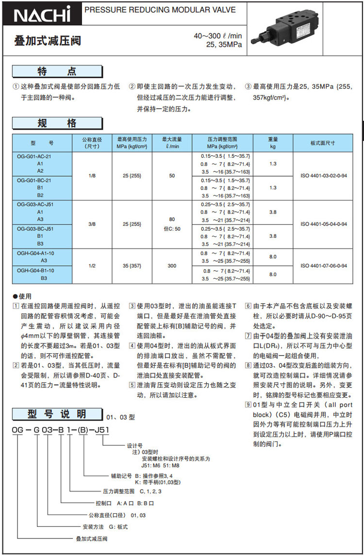 OG-G01,OG-G03,OGH-G04,OG-G01-AC-21,OG-G03-AC-J51,OGH-G04-B3-10,NACHI疊加式減壓閥