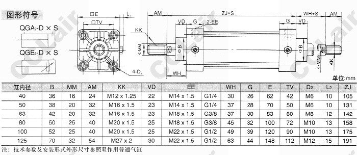 型號: QGA2-40,QGA2-50,QGA2-63,QGA2-80,QGA2-100,QGA2-125,雙作用雙活塞桿氣缸