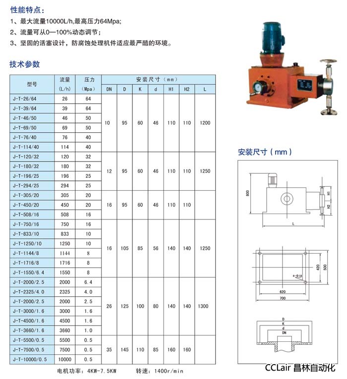 詳細信息 J-T-305/20,J-T-450/20,J-T-508/16,J-T-750/16,J-T-833/10,柱塞計量泵