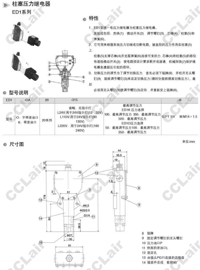 ED1-OA20,ED1-KA20,ED1-OA20-315-L24V-G,ED1-KA20-315-L24V-G,ED1-OA20-315-L220V-G,柱塞壓力繼電器