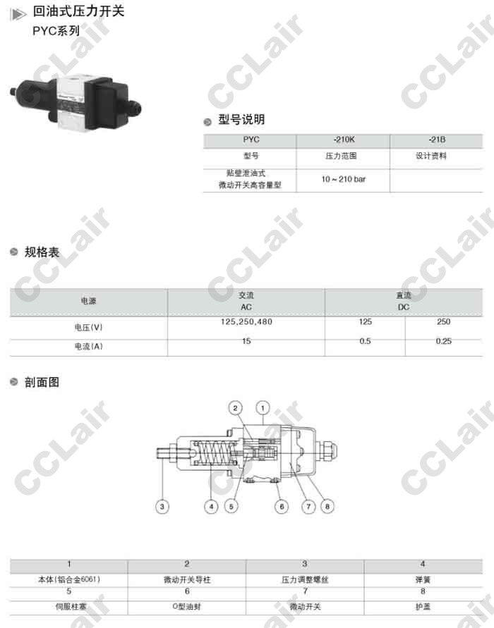 詳細(xì)信息 PYC-210K-21B,回油式壓力開關(guān),無錫昌林
