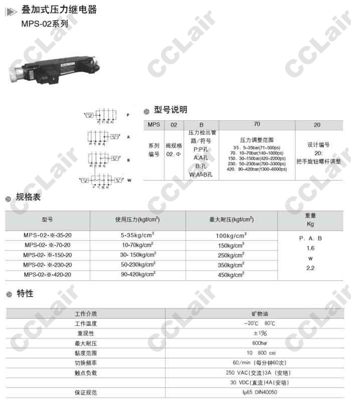 MPS-02-P-35-20,MPS-02-A-70-20,MPS-02-B-150-20,MPS-02-B-230-20,MPS-02-W-420-20,疊加式壓力繼電器
