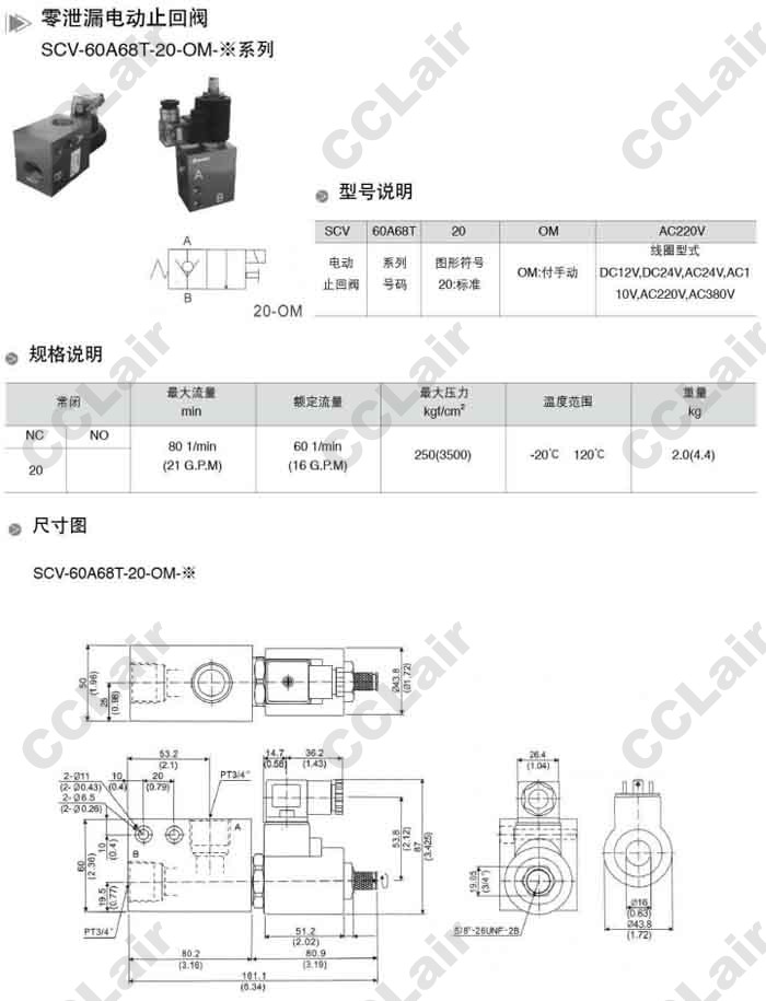 型號: SCV-60A68T-20-OM-DC12V,SCV-60A68T-20-OM-DC24V,SCV-60A68T-20-OM-AC24V,零泄漏電動止回閥