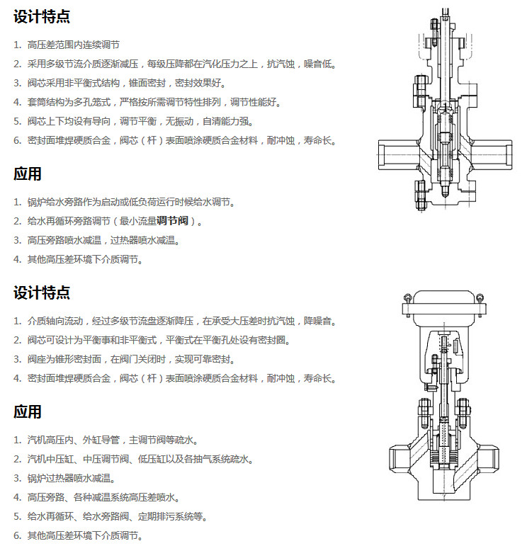 ZHD電子式電動多級調(diào)節(jié)閥采用的是多級籠式套筒閥芯或軸流迷宮型閥芯,多級減壓,完全控制流過閥內(nèi)的介質(zhì)的流速,大幅度的降低了高壓氣體或者蒸汽在閥內(nèi)產(chǎn)生的噪音,穩(wěn)定的多級別降壓有效使液體不會產(chǎn)生氣蝕,是使用在高壓介質(zhì)場所性能穩(wěn)定的控制閥,可選擇多彈簧氣動薄膜機構(gòu)或電動執(zhí)行機構(gòu)等。