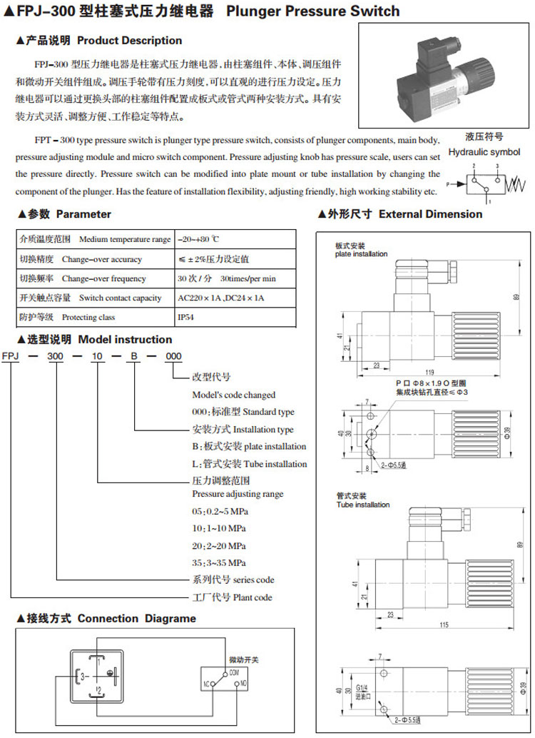詳細信息 FPJ-300-05,FPJ-300-10,FPJ-300-20,FPJ-300-35,柱塞式壓力繼電器