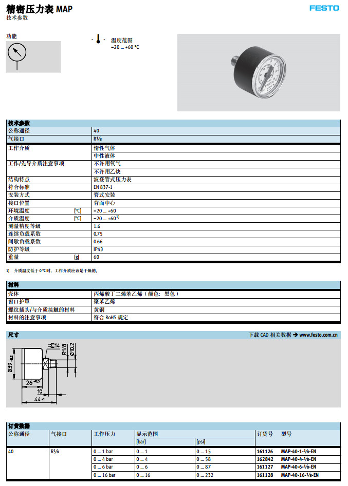詳細信息 MAP-40-1-1/8-EN,MAP-40-4-1/8-EN,MAP-40-6-1/8-EN,festo精密壓力表