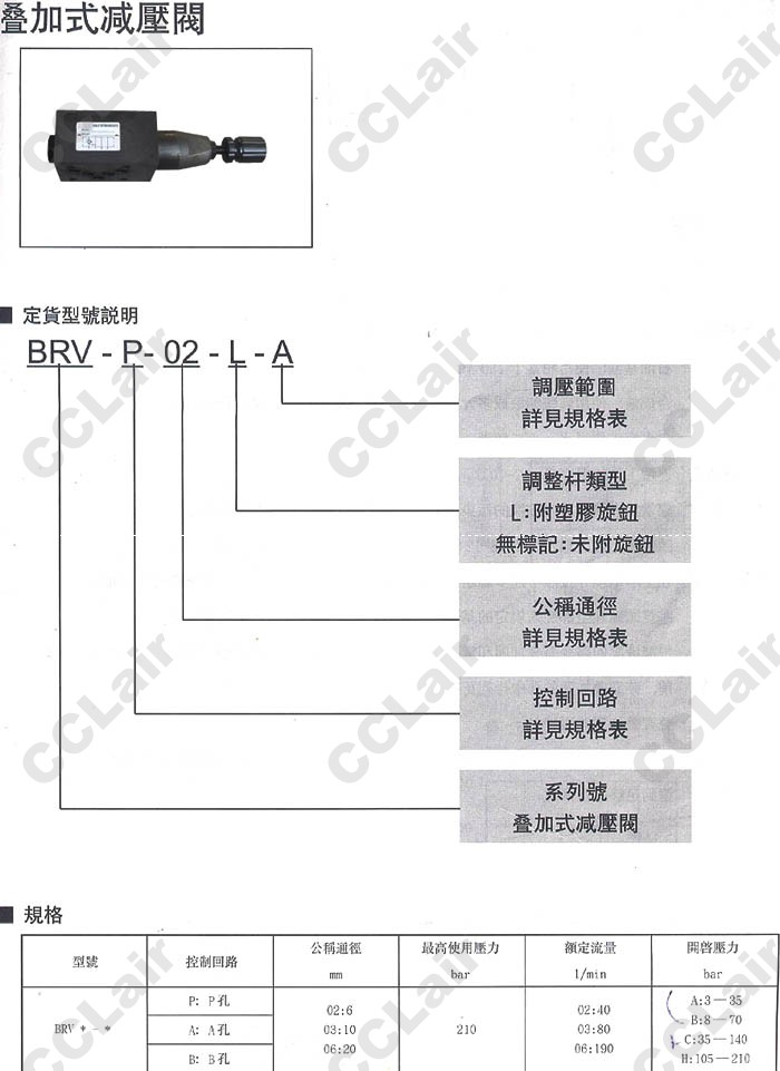 BRVP-02-L-A,BRVP-03-L-A,BRVP-06-L-A,BRVP-02-L-B,BRVP-03-L-B,BRVP-06-L-B,疊加式減壓閥