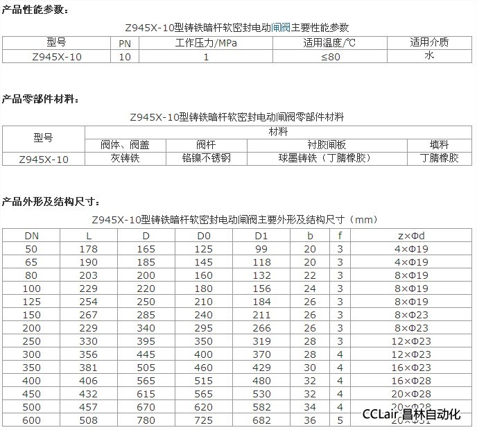 Z945X-10 型鑄鐵電動(dòng)暗桿軟密封閘閥:電動(dòng)、法蘭連接、暗桿楔式剛性單閘板,閥座密封面材料為丁腈橡膠,公稱(chēng)壓力 PN10,閥體材料為灰鑄鐵的閘閥。