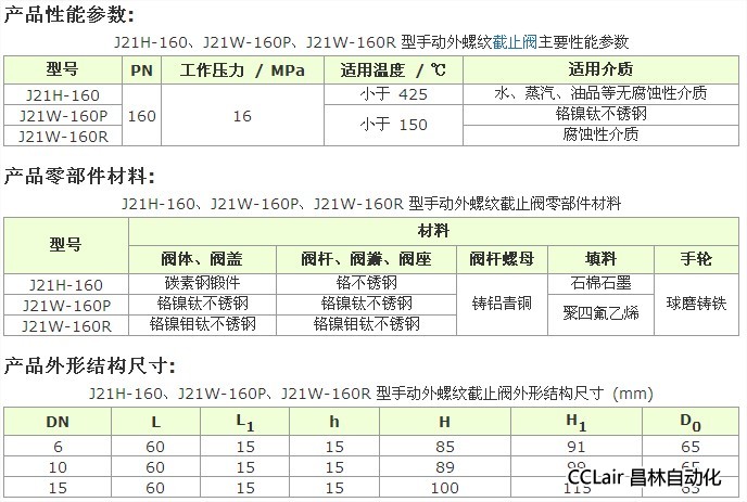 J21H-160、J21W-160P、J21W-160R 型外螺紋截止閥:手動、外螺紋連接形式、直通式結構,閥座密封面材料為不銹鋼、工作壓力 16.0 MPa、公稱尺寸 DN6~DN15、閥體材料為碳素鋼(J21H)、不銹鋼(J21W),適用于水、蒸汽、油品(J21H),弱腐蝕性或腐蝕性(J21W)介質管路中。