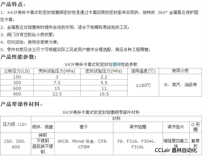 X43F美標卡套式軟密封旋塞閥適用于公稱壓力CLASS150-900LBS,工作溫度為-29-180℃的石油、化工、制藥、化肥、電力行業(yè)等各種工況的管路上,切斷或接通管路介質(zhì)。