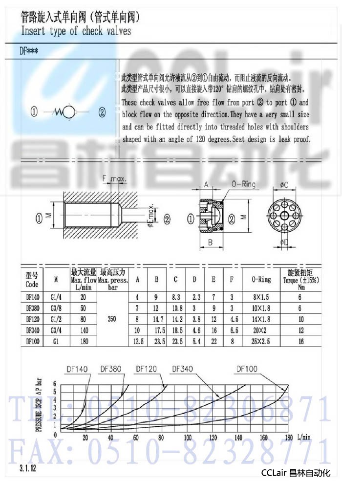 DF140,DF380,DF120,DF340,DF100,管路旋入式單向閥