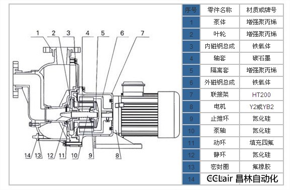 過流部件材質:PP(增強聚丙烯)、PVF2(聚偏二氟乙烯)