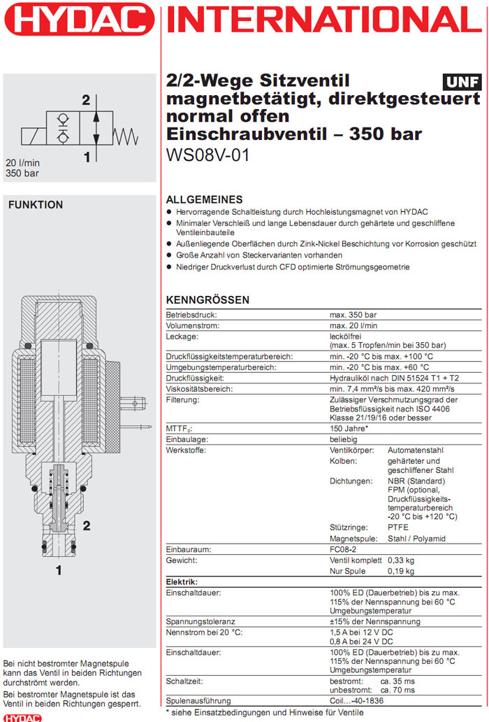 首頁 > 產(chǎn)品&解決方案 > WS08V-01-C-N-24DG,WS08V-01-C-N-230AG,HYDAC電磁2/2方向座閥
