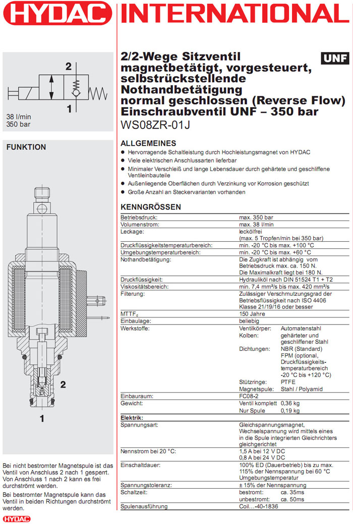 首頁 > 產(chǎn)品&解決方案 > WS08ZR-01J-C-N-24DG,WS08ZR-01J-C-N-230AG,HYDAC電磁2/2方向座閥