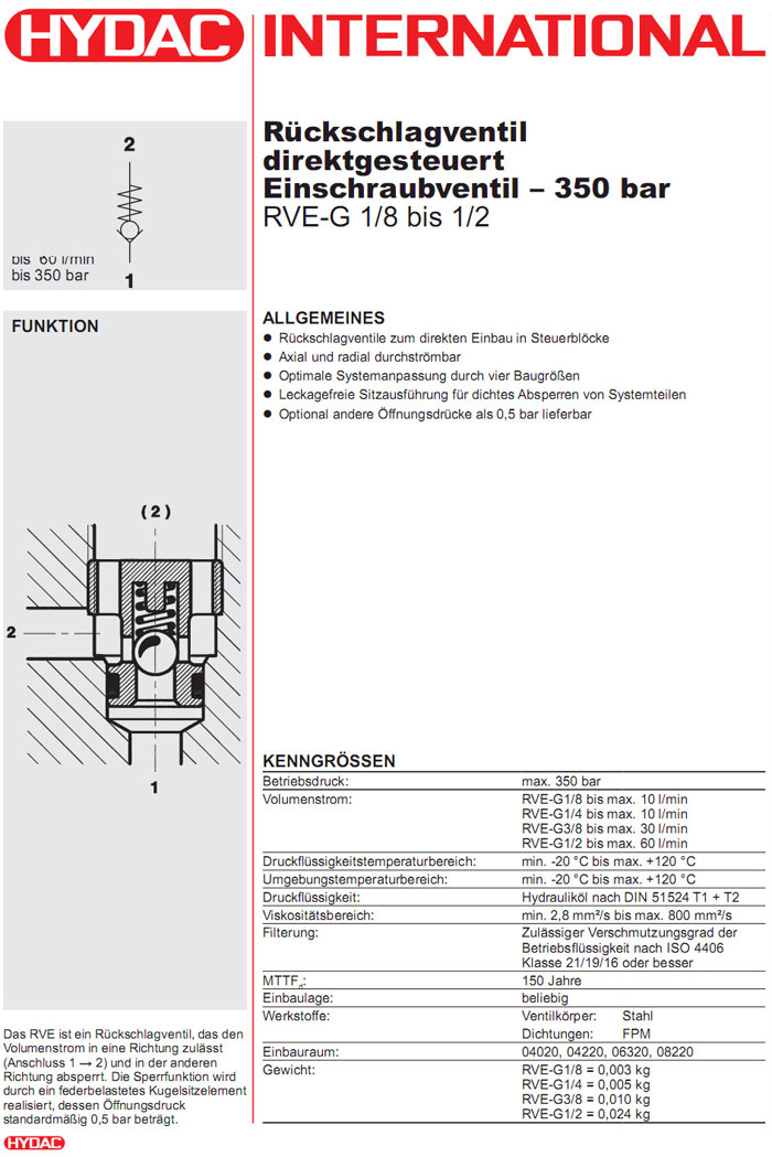 RVE-G1/8-X,RVE-G1/4-X,RVE-G3/8-X,RVE-G1/2-X,HYDAC止回閥
