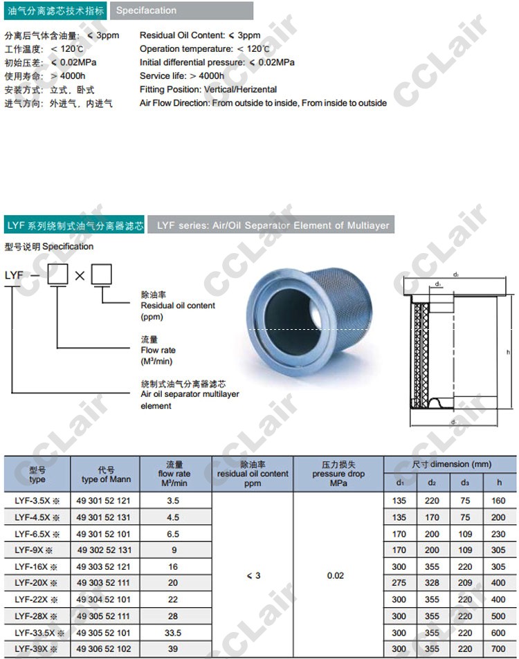 LYF-3.5,LYF-4.5,LYF-6.5,LYF-9,LYF-16,LYF-20,LYF-22,LYF-28,LYF-33.5,LYF-39,油氣分離器濾芯