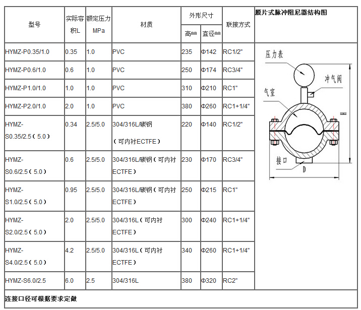 1、 膜片式脈沖阻尼器的容積、材質(zhì)、連接方式(或提供泵的流量、壓力、介質(zhì)、材質(zhì),由我公司為您提供精確選型)