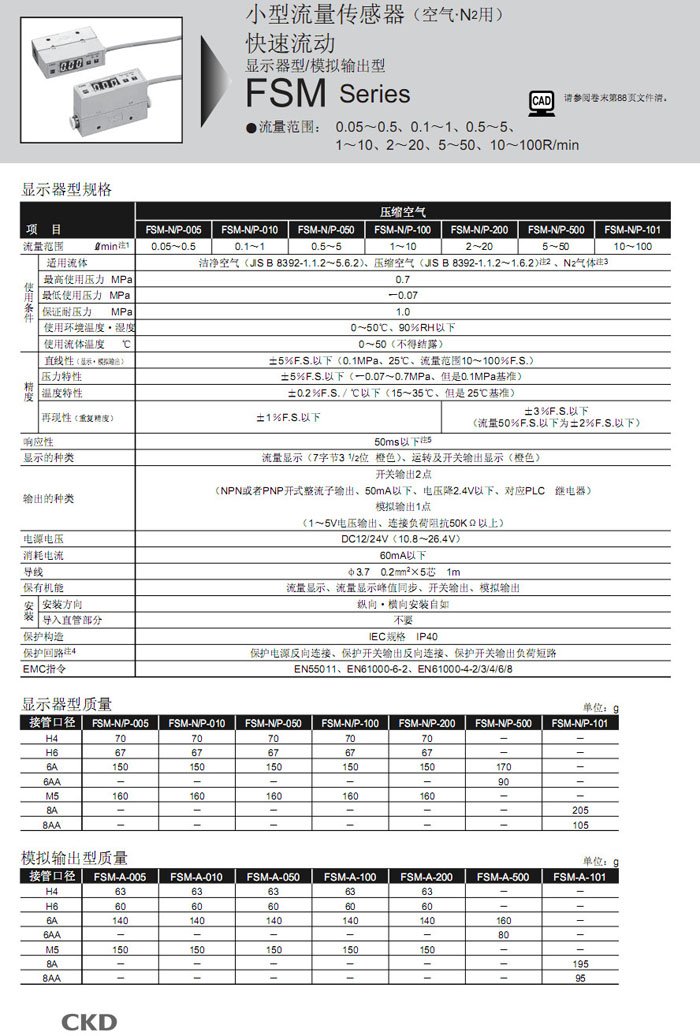 FSM-N-005,FSM-P-005,FSM-A-005,FSM-N-010,FSM-P-010,FSM-A-010,FSM-N-050,CKD流量傳感器