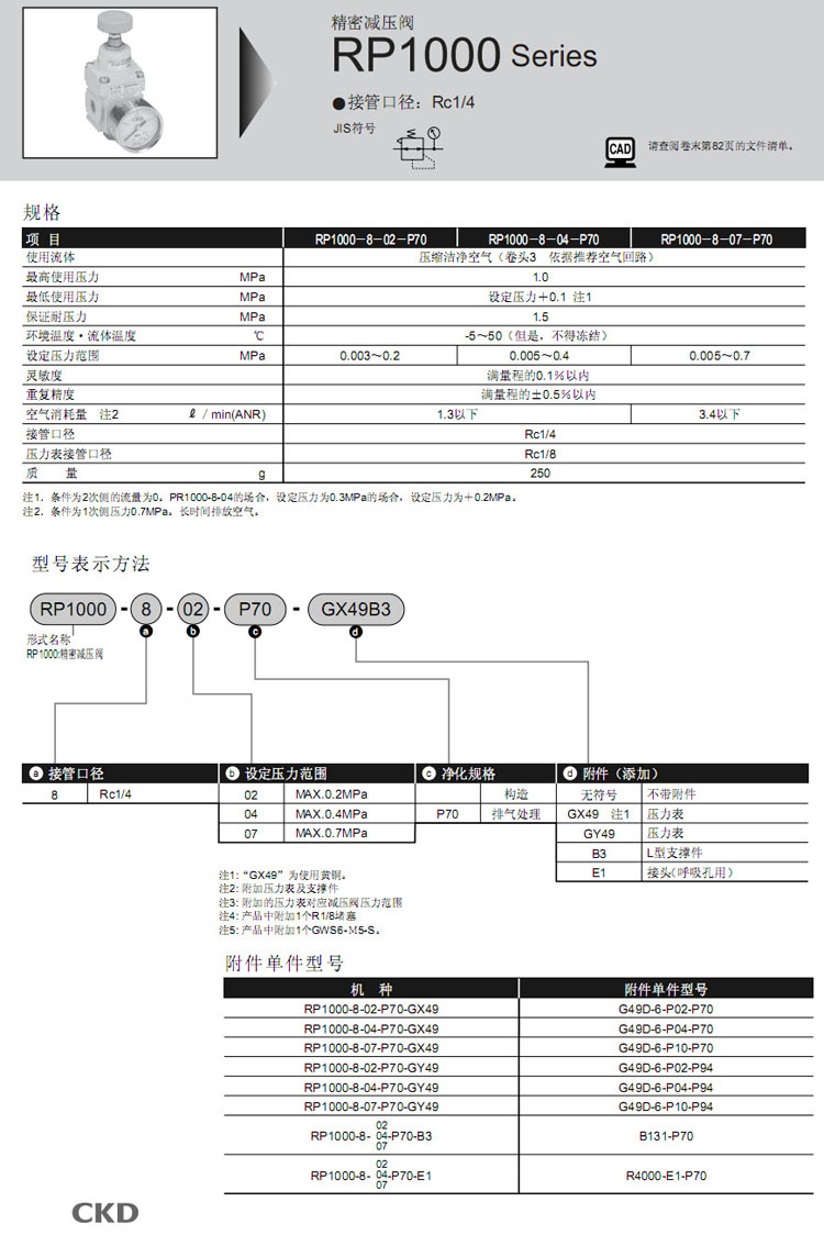 詳細(xì)信息 RP1000-8-02-P70,RP1000-8-04-P70,RP1000-8-07-P70,CKD精密減壓閥