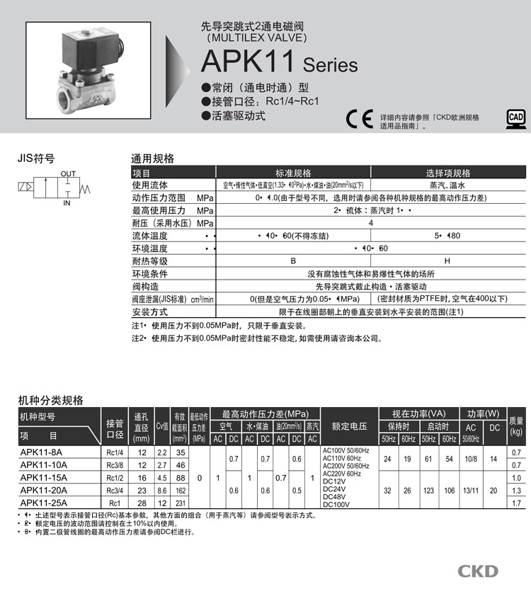 APK11-8A,APK11-10A,APK11-15A,APK11-20A,APK11-25A,CKD先導(dǎo)式2通電磁閥