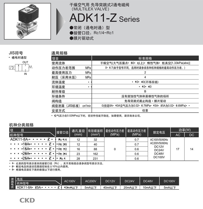 ADK11-8A,ADK11-10A,ADK11-15A,ADK11-20A,ADK11-25A,CKD先導(dǎo)式式2通電磁閥
