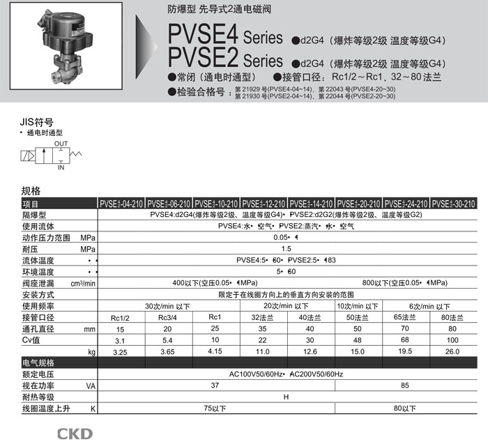 PVSE2-04,PVSE2-06,PVSE2-10,PVSE2-12,PVSE2-14,PVSE2-20,PVSE2-24,PVSE2-30,PVSE2-04-210,CKD先導式2通電磁閥