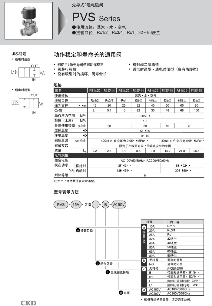 詳細(xì)信息 PVS-15A-210,PVS-20A-210,PVS-25A-210,PVS-32A-210,PVS-40A-210,PVS-50A-210,PVS-65A-210,PVS-80A-210,CKD先導(dǎo)式2通電磁閥