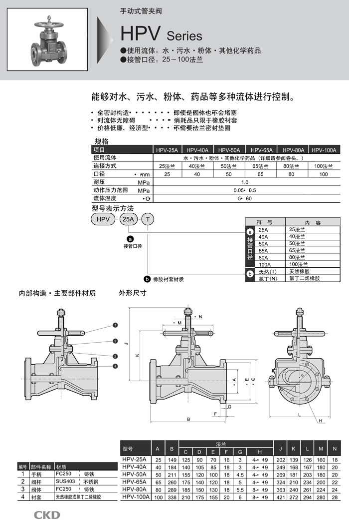 HPV-25A,HPV-40A,HPV-50A,HPV-65A,HPV-80A,HPV-100A,CKD手動式管夾閥