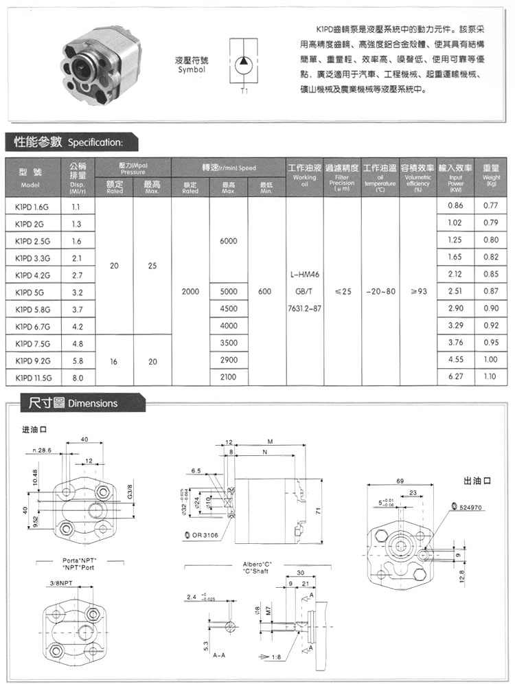 K1PD1.6G,K1PD2G,K1PD2.5G,K1PD3.3G,K1PD4.2G,K1PD5G,K1PD5.8G,高壓齒輪油泵