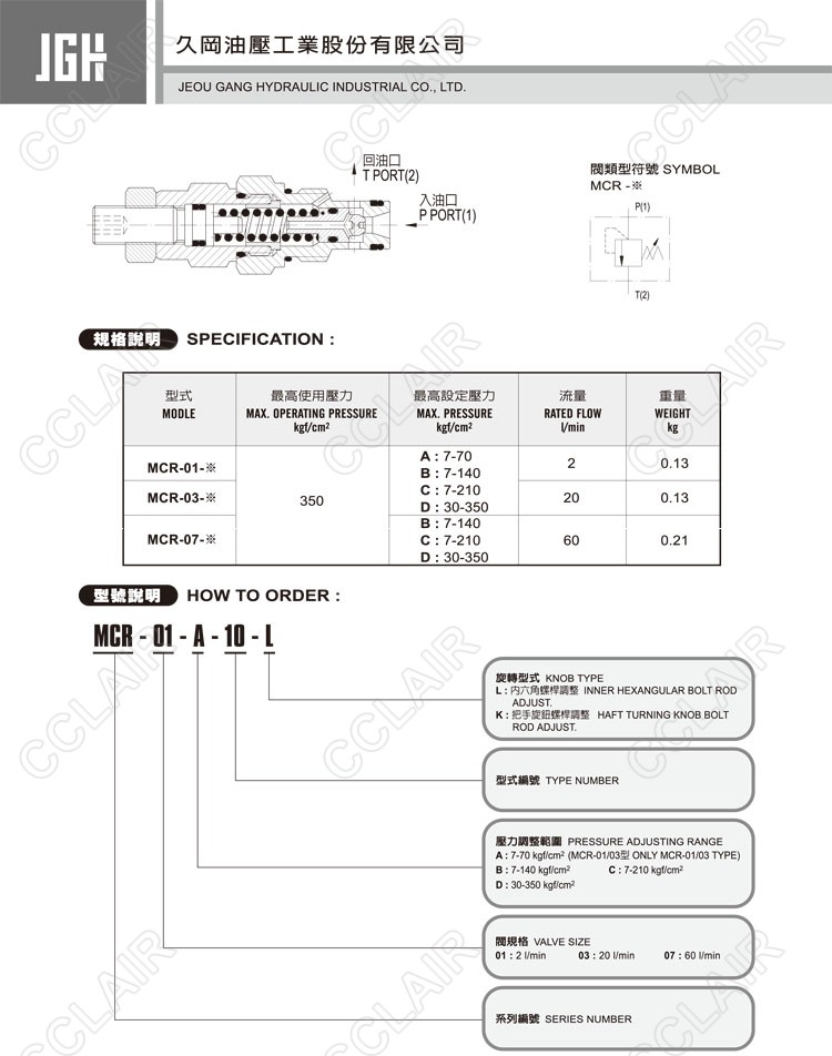 JeouGang臺灣久岡,直動式溢流閥MCR-01-A-10-L,MCR-01-A-10-K,MCR-01-D-10-L,MCR-01-D-10-K,MCR-03-A-10-L,MCR-03-A-10-K,MCR-03-D-10-L,MCR-03-D-10-K,MCR-07-A-10-L,MCR-07-A- 10-K,MCR-07-C-10-L,MCR-07-C-10-K,MCR-07-D-10-L,MCR-07-D-10-K