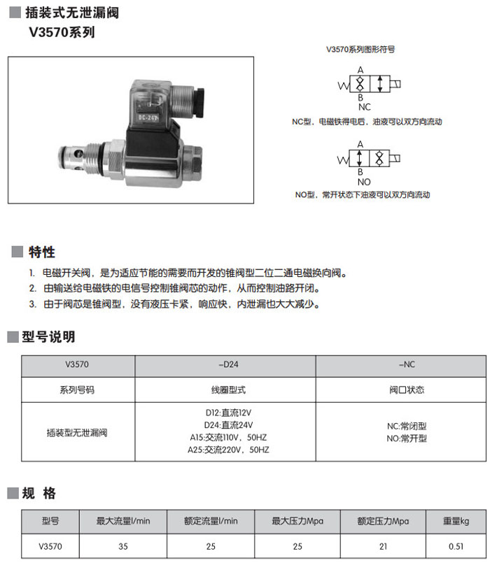 V3570-D24-NC,V3570-D24-NO,V3570-D12-NC,V3570-D12-NO,V3570-A15-NC,V3570-A15-NO,插裝式無(wú)泄漏閥