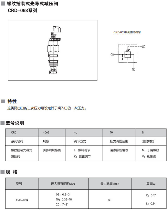 CRD-063-L03N,CRD-063-L10N,CRD-063-L20N,CRD-063-K03N,CRD-063-K10N,CRD-063-L30N,螺紋插裝式先導(dǎo)式減壓閥 詳細(xì)信息 CRD-063-L03N,CRD-063-L10N,CRD-063-L20N,CRD-063-K03N,CRD-063-K10N,CRD-063-L30N,螺紋插裝式先導(dǎo)式減壓閥