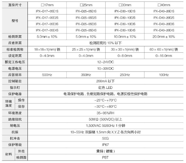 詳細(xì)信息 IPX-D17-05E1S,IPX-D25-05E1S,IPX-D30-10E1S,IPX-D40-20E1S,IPX-2D17-05A1S,Koino方形接近開關(guān)