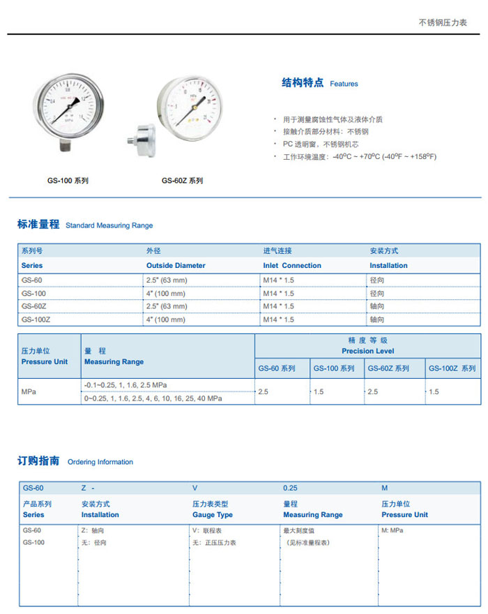 GS-60,GS-100,GS-60Z,GS-100Z,GS-60Z-V2.5M,GS-100Z-V2.5M,不銹鋼壓力表