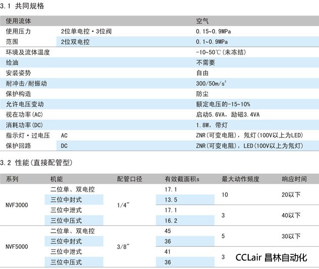 AC2100V~240V、介質(zhì)為經(jīng)過(guò)濾干燥的清潔空氣、工作壓力為0.15~0.9MPa。NVF3000、NVF5000系列電磁