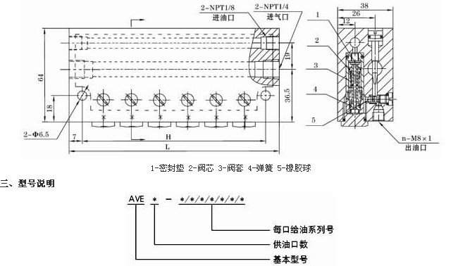 | 從進(jìn)油口處進(jìn)入的壓力油,在油壓的作用下件1下移,緊貼在件2上端面封住了通油通道,同時(shí)打開(kāi)了進(jìn)油通道向件3上腔充油,件3在油壓作用下克服件4彈簧力向下移動(dòng),則件3下腔的油頂開(kāi)件5進(jìn)入混合腔,在壓縮空氣的作用下經(jīng)混合后的油氣從油氣出口排出。供油主管卸荷后,件1上部油壓低并且件3在件4的作用下向上回位,件3上腔充入的油經(jīng)已打開(kāi)的件2上端面流道孔進(jìn)入件3下腔儲(chǔ)存,為下一循環(huán)供油作好準(zhǔn)備。各口的供氣量可通過(guò)節(jié)流螺絲的開(kāi)口大小進(jìn)行調(diào)節(jié)。 |
