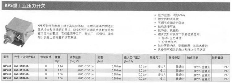 詳細(xì)信息 KPS31,KPS33,KPS35,KPS43,KPS45,KPS37,KPS47,KPS39,重工業(yè)壓力開關(guān)