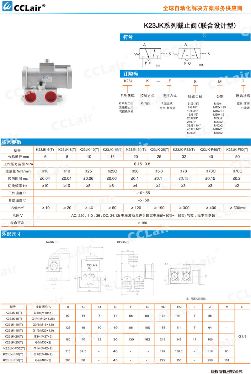 K23JK-6,K23JK-8,K23JK-10,K23JK-15,K23JK-F32,K23JK-15T,K23JK-F40,K23JK-F50T,二位三通截止式氣控?fù)Q向閥