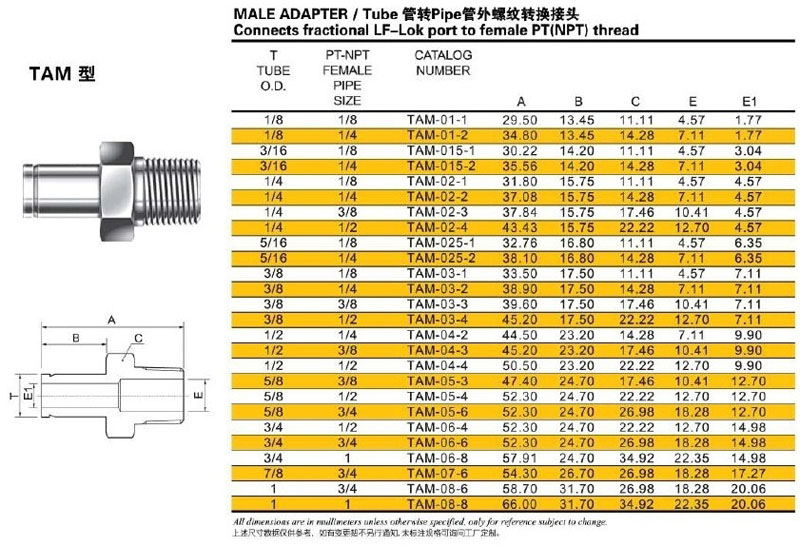 詳細(xì)信息 TAM-01-1,TAM-07-6,TAM-015-2,TAM-02-1,TAM-04-4,TAM-05-3,管外螺紋轉(zhuǎn)換接頭