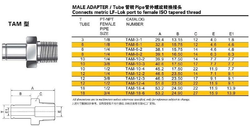 詳細(xì)信息 TAM-3-1,TAM-6-1,TAM-10-2,TAM-6-2,TAM-8-2,TAM-10-3,TAM-10-4,管外螺紋轉(zhuǎn)換接頭