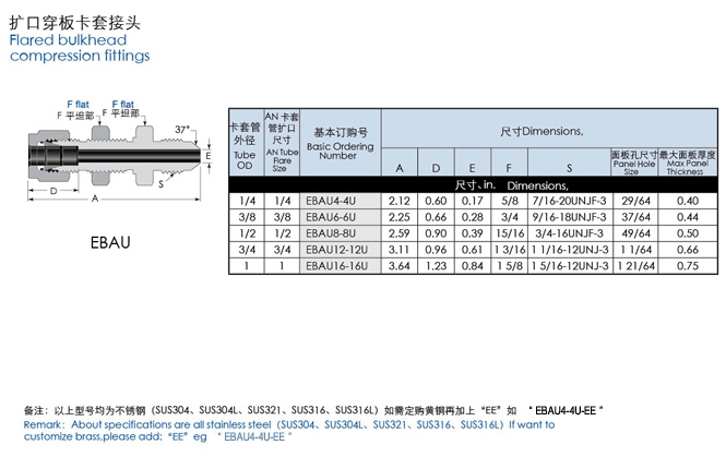 EBAU4-4U,EBAU6-6U,EBAU8-8U,EBAU12-12U,EBAU16-16U,直通擴口穿板卡套接頭
