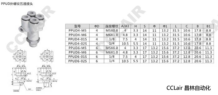 PPUD4-M5,PPUD4-M6,PPUD4-01S,PPUD4-02S,PPUD6-M5,PPUD6-M6,PPUD6-01S,外螺紋五通接頭