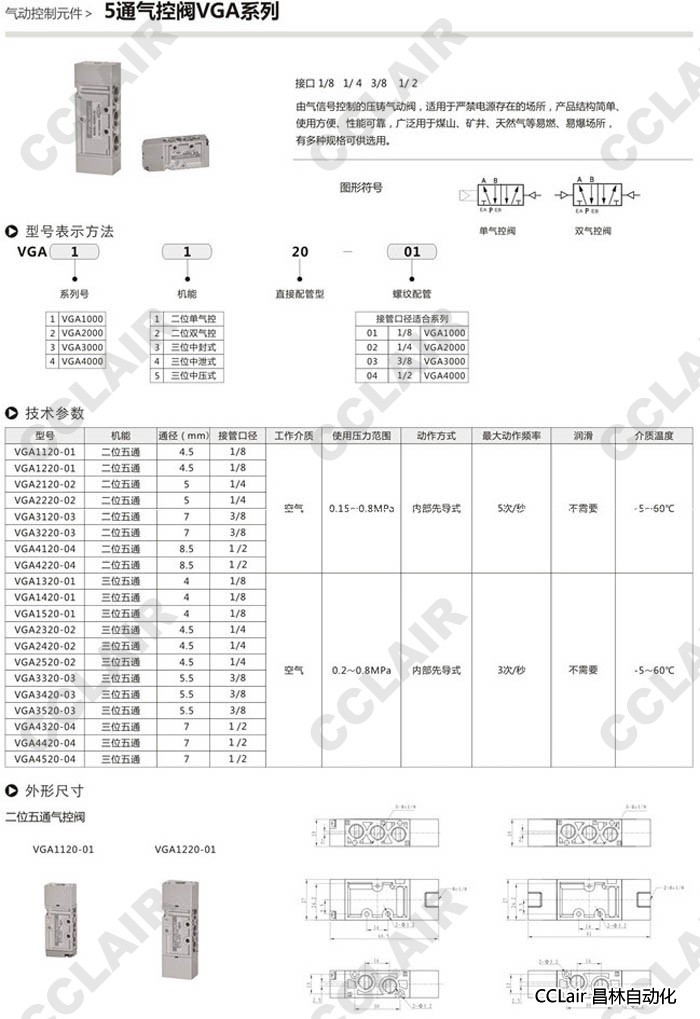 VGA1120-01,VGA1220-01,VGA2120-02,VGA2220-02,VGA3120-03,VGA3220-03,5通氣控閥