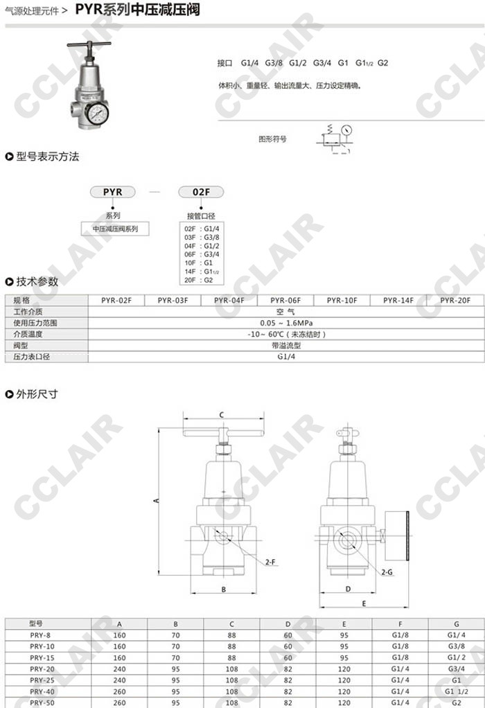 詳細信息 PYR-02F,PYR-03F,PYR-04F,PYR-06F,PYR-10F,PYR-14F,PYR-20F,氣動中壓減壓閥