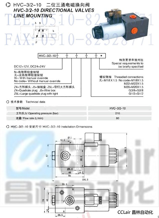 HVC-3/2-10, 二位三通電磁換向閥