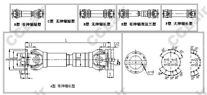 | 型號 | 回轉(zhuǎn)直徑D | 公稱轉(zhuǎn)矩Tn KN.m | 疲勞轉(zhuǎn)矩Tn KN.m | 軸線折角 < | 標準伸縮量 S | 尺寸 mm | ||||||||